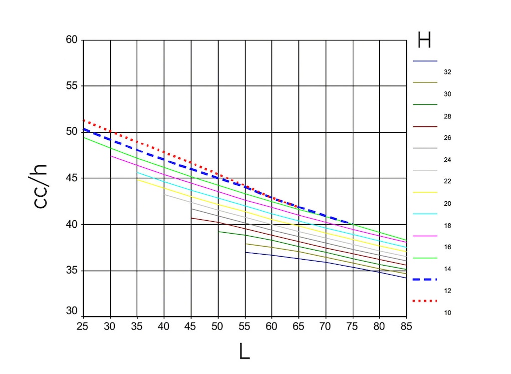 Ci-dessous, le graphique montre approximativement le nombre de cycles combinés pouvant être obtenus pour les rayonnages à profondeur simple, en faisant varier la hauteur et la longueur des rayonnages. Plus la longueur des rayonnages est importante, moins le nombre de cycles est élevé (le transstockeur doit parcourir de plus grandes distances). De même, la hauteur est inversement proportionnelle au nombre de cycles combinés/heure (cc/h).