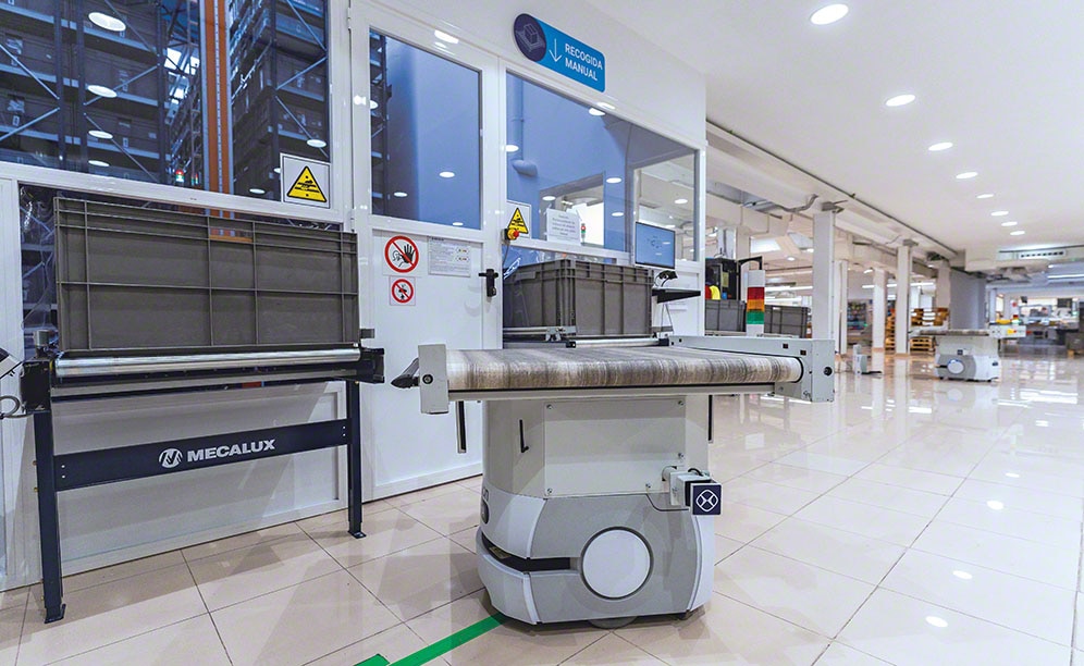 La priorité pour Normagrup concernant cet entrepôt était, d'une part, son fonctionnement entièrement automatisé et, d'autre part, la manipulation continue et en sécurité des marchandises par les engins de manutention. Pour cette raison, un transstockeur bicolonne situé dans chaque allée introduit et extrait rapidement les bacs de leurs emplacements. Il déplace ensuite les bacs vers l’avant de l’entrepôt, où se trouvent les convoyeurs. C'est ici que les AIV récupèrent les marchandises et les acheminent vers l’une des trois lignes de production.