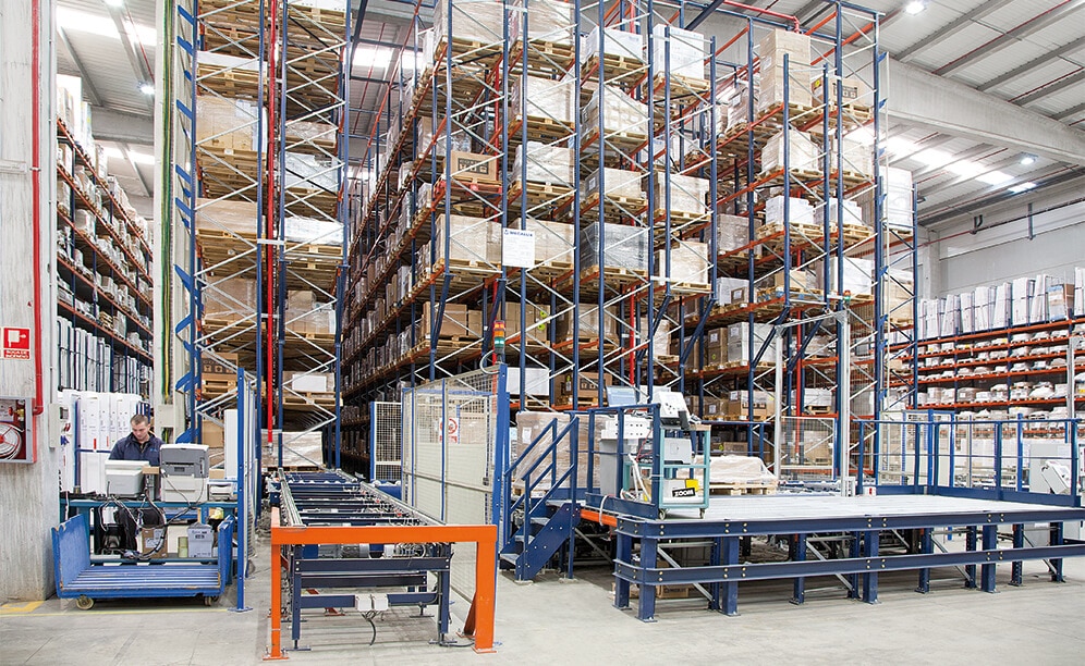 - Picking dans les rayonnages classiques : à côté de l’entrepôt automatique ont été disposés six rayonnages à palettes classiques double profondeur, où est effectué le picking des produits de type C, les plus volumineux étant placés dans la partie inférieure. La partie supérieure a également été affectée au stockage de la réserve palettisée des produits de type B de l’entrepôt automatique. Les rayonnages de 10,5 mètres de haut peuvent contenir jusqu’à 6 000 palettes.